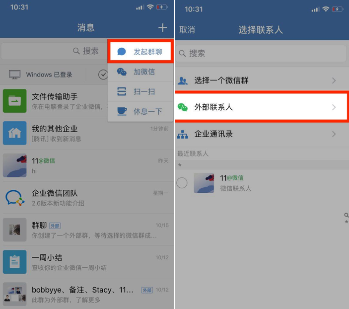 外部群的创建可在企业微信手机端消息页右上角功能键【+】->【发起群聊】->【外部联系人】选择一个或多个联系人创建;