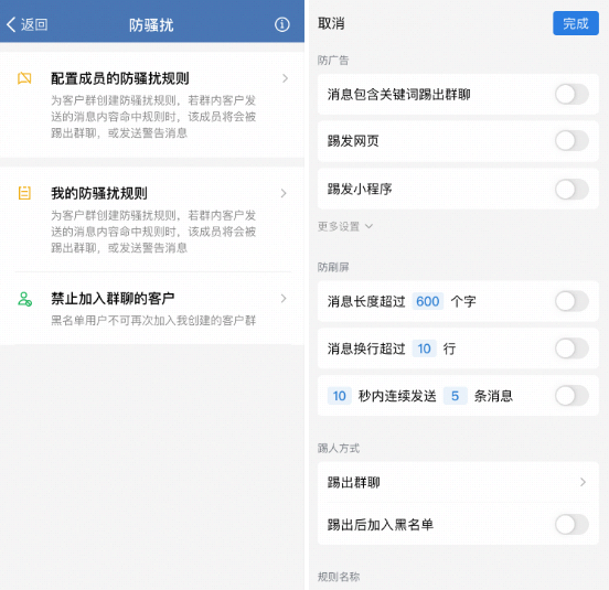 企业可在「工作台」-「客户群」-「防骚扰」中统一配置成员的防骚扰规则。支持管理员和业务负责人配置企业的规则,由成员选择使用。