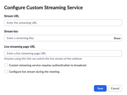 请按照下方相应部分的说明,设置会议或网络研讨会的定制直播: