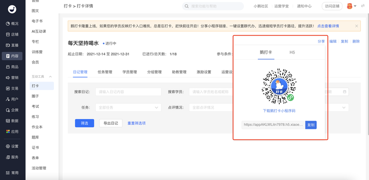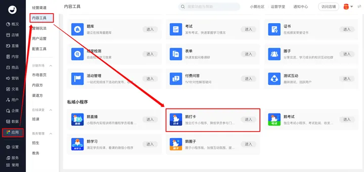 二是点击左侧菜单栏的【应用】,选择【内容工具】,点击【鹅打卡】,进入鹅打卡配置页。
