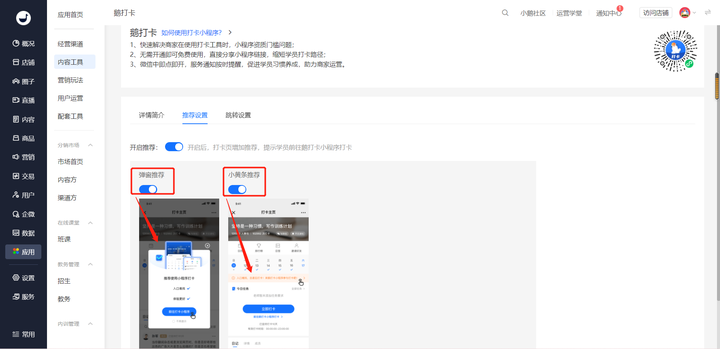 开启推荐。推荐设置可以开启弹窗推荐和开启小黄条推荐,这样您每次进入H5的打卡主页,页面均会自动弹出建议到鹅打卡小程序打卡的弹窗或长驻一条建议到鹅打卡小程序打卡的提示。