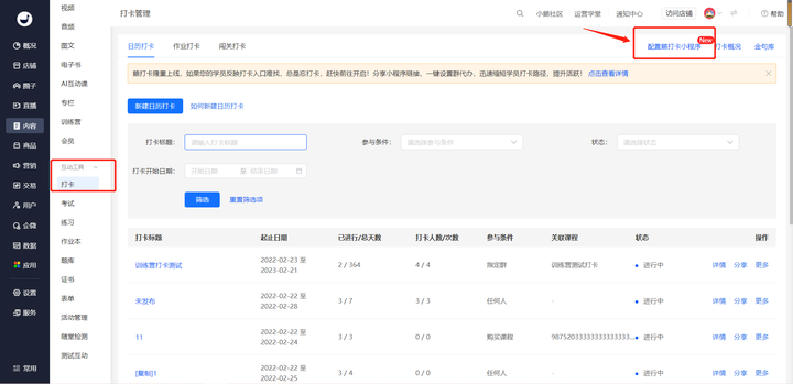 进入鹅打卡配置页。可以通过两种方式进入:一是登录小鹅通账号,点击左侧菜单栏的【内容】,选择【打卡】,进入<打卡管理>页,点击右上角【配置鹅打卡小程序】,即可跳转至鹅打卡配置页;