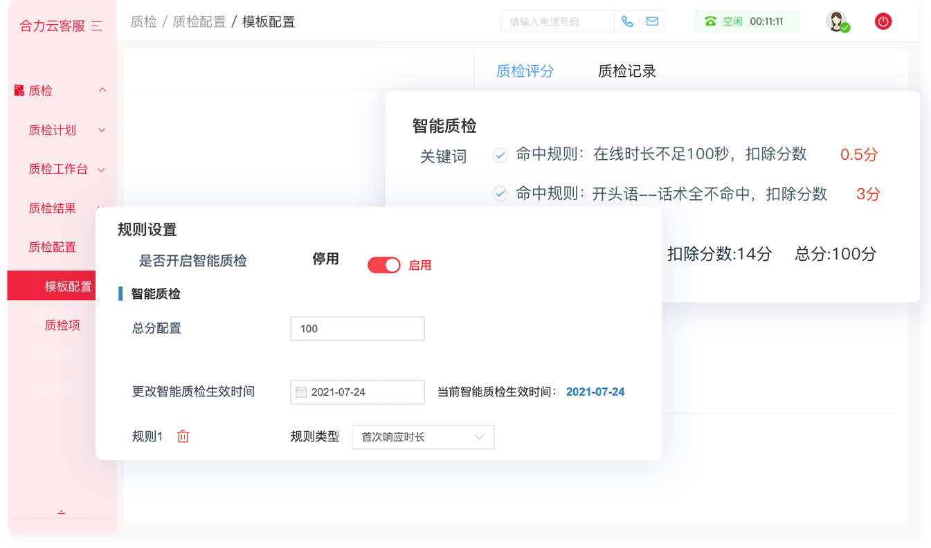 根据响应时长、关键词等质检项自动为坐席服务水平打分,并支持质检结果进行人工复检校准。