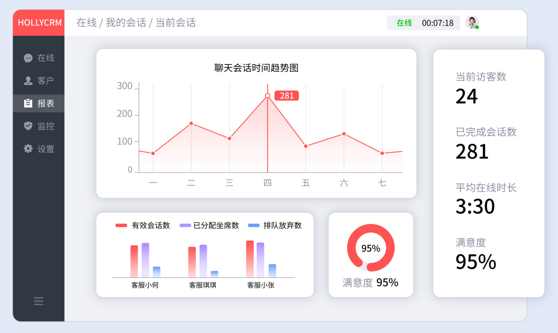 提供自定义报表的功能,方便企业查看坐席工作量、满意度、会话标签、访客来源、搜索关键词等多种业务数据报表。