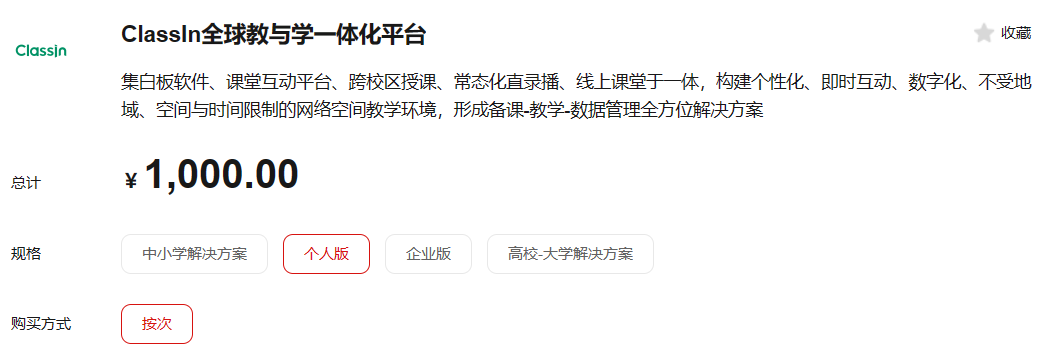 对于个体老师,classin可以提供集白板软件、课堂互动平台、跨校区授课、常态化直录播、线上课堂于一体,为您构建个性化、即时互动、数字化、不受地域、空间与时间限制的网络空间教学环境,形成备课-教学-数据管理全方位解决方案,如果是一对多课程,收费为1000元/次;一对一的价格不同,根据用户反馈:有一对一标准价格是:2元/学生/小时。供您参考~~
