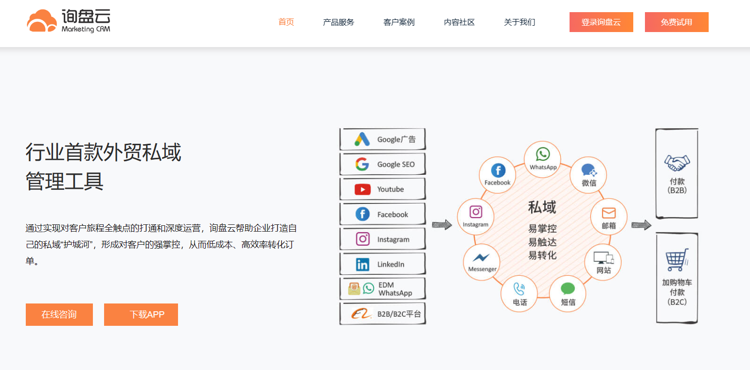 询盘云隶属于北京鑫互联科技有限公司(简称“鑫互联”)是专业的全流程出海营销解决方案提供商,致力于帮助B2B外贸企业提升数字营销效果;其SaaS产品“询盘云”覆盖从流量到着陆、交互直至销售订单的“营销+销售”全流程管理,为企业建立完整的数字营销闭环,同时基于SaaS平台为客户提供数字广告和网站建设等扩展服务,帮助外贸企业挖掘潜客,提升转化,一站式实现业务增长。