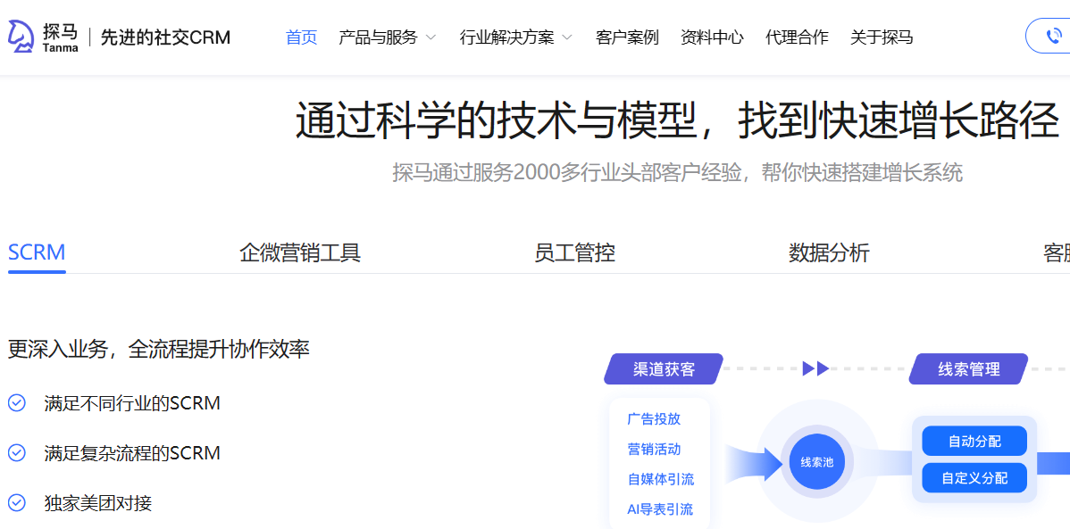 1)探马SCRM为企业级客户提供全流程私域流量解决方案与咨询服务,构建以探马平台为基础,涵盖智能销售系统、智能小站、企业微信scrm、企业微信社群、API接口、定制化开发、私有化部署等智能应用的私域流量产品体系。通过多渠道获客、多内容多样式触客、养客、全维度客户画像、销售管理,驱动私域流量的高效构建与精细运营,帮助企业打造私域流量体系。