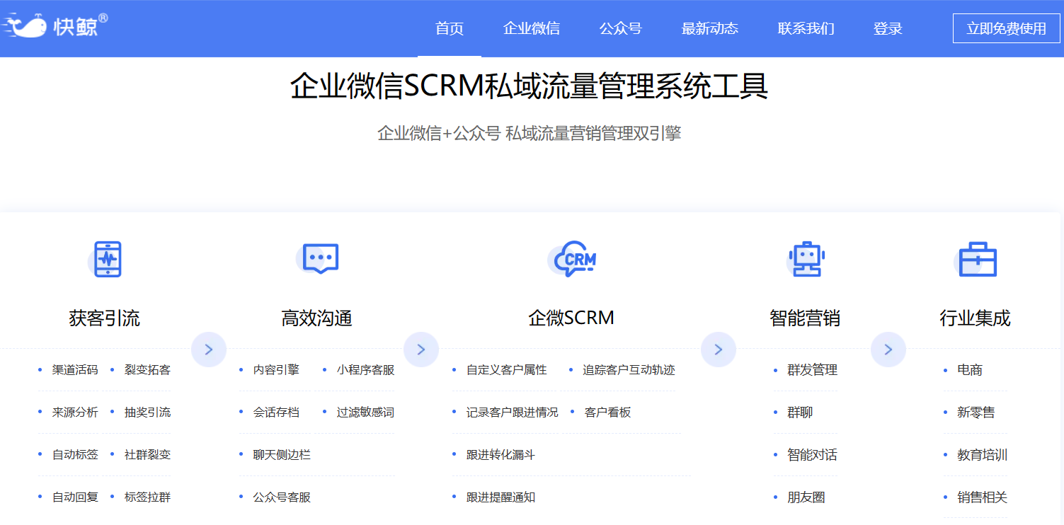 2)快鲸SCRM是合肥快鲸科技有限公司旗下的新一代企业微信SCRM系统,快鲸SCRM功能涵盖CRM客户管理系统工具、企微营销、企业微信会话存档、私域流量管理运营、裂变获客、用户行为分析等系统功能;融合企业微信、微信客服、公众号小程序客服、外呼、短信、飞鱼CRM等客户来源渠道,是全渠道SCRM系统。
