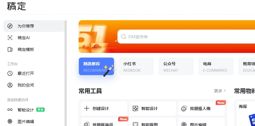 稿定设计:涵盖的设计场景包括新媒体、电商、金融保险、餐饮门店、企业商务、娱乐、在线印刷等。