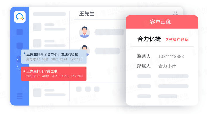 合力亿捷直接打通企业CRM、订单系统、原有IT系统与微信之间的链路,让企业自有客户信息能集成到企微右侧栏,让销售人员在面对用户咨询时,能在企微端能清晰完整地了解客户信息,如:用户偏好,订单信息,历史会话记录等,从而帮助销售了解客户意向,有计划在企业微信上触达客户微信。