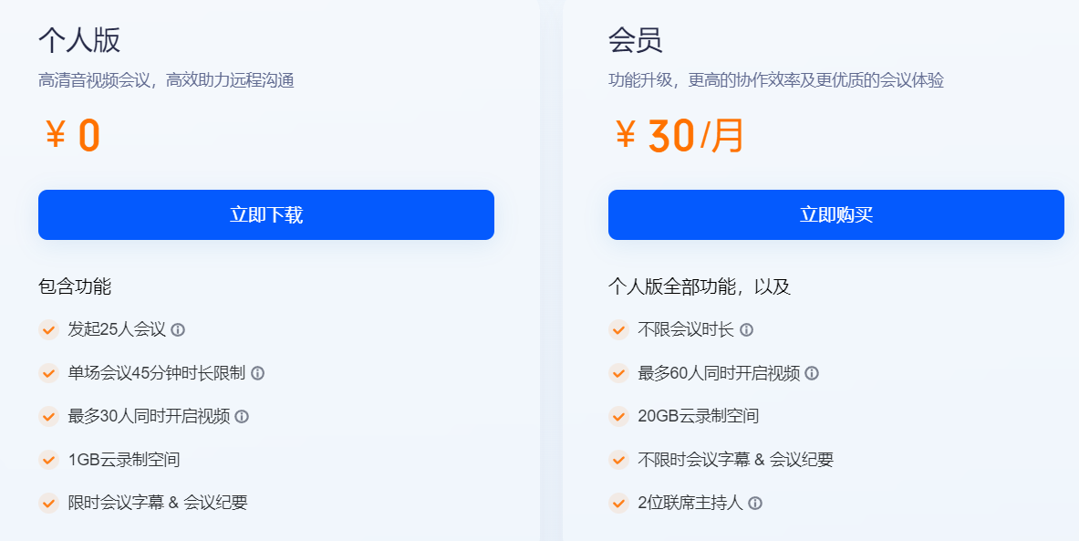 ②会员版,每个月30元。不限制会议时长,60人同时开启视频,有20GB的云录制空间,不限时会议字母和会议纪要、2位联席主持人。
