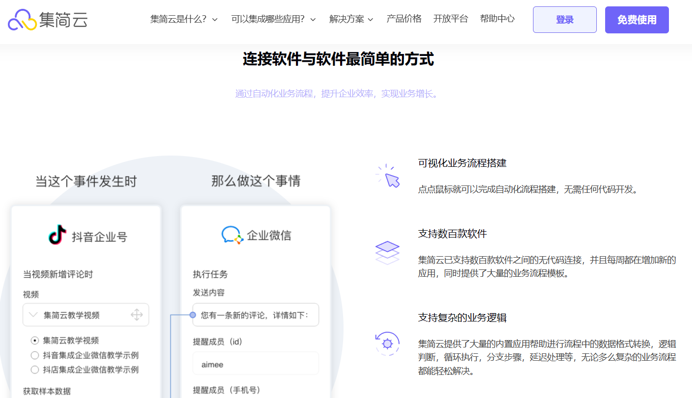 集简云无代码集成平台,无需开发集成企业微信,简道云,微信公众号,飞书OA,金数据,纷享销客,爱客CRM,飞鱼, 抖音,有赞商城电子商务系统,MySQL数据库等数十种企业外部与内部系统,帮助企业搭建自动化与智能化的业务流程。
