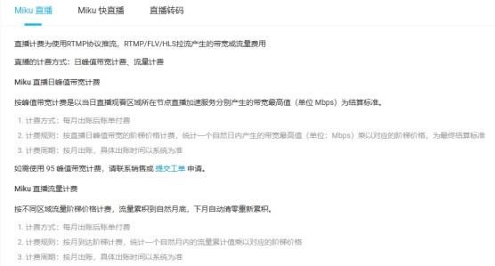 1、Miku 直播服务默认为带宽计费
