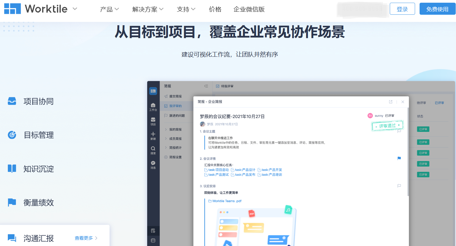 核心功能:在功能上Worktile 是一个工具集合,它具备OKR目标管理、项目管理、项目集管理、项目计划、项目风险、项目成本管理、企业网盘、审批、简报等能力。并且具备强大的自定义能力,能够配置出符合各种项目团队的流程、表单、字段、数据报表,以及具备丰富的模板市场。
