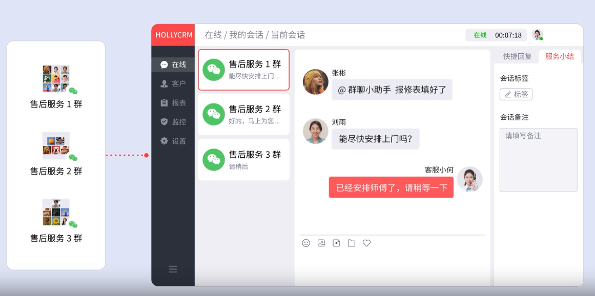当企微与企业自身的业务系统打通后,企微客服助手就能将各渠道群聊的咨询统一到客服系统后台进行接待。且有群客服机器人的加持,7*24小时不间断服务,通过智能应答、提供即时回复等方式,若遇复杂问题再转接人工接待,可以更加快速和准确地响应客户的问题和反馈,这在一定程度上可以大大提高响应效率。