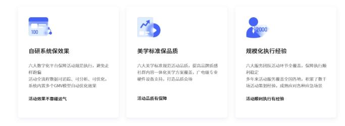 会场工具和内容的完美融合,项目介绍、优惠折扣、效果对比、互动抽奖和福袋红包等一目了然。