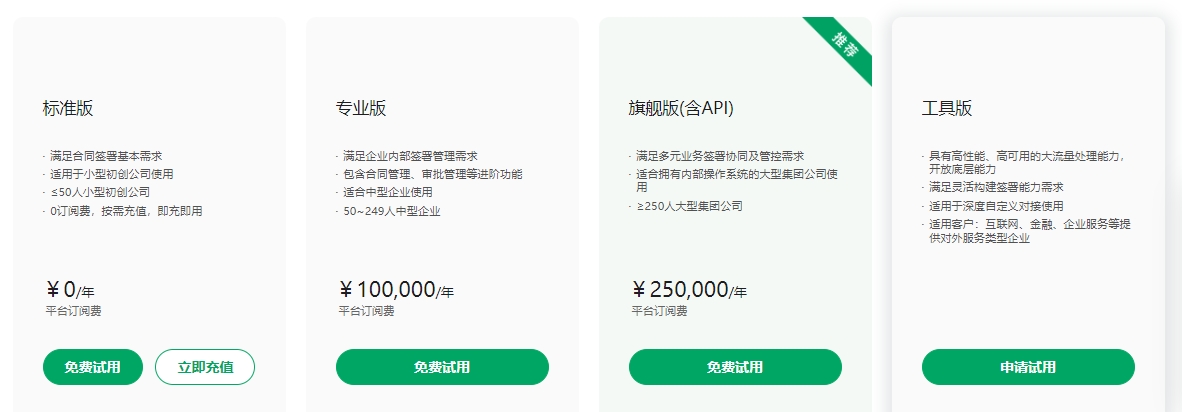 旗舰版(含API):250,000/年,满足多元业务签署协同及管控需求,适合拥有内部操作系统的大型集团公司使用。