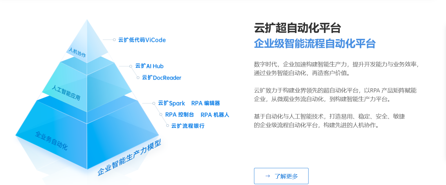 3)云扩科技是一家提供企业级RPA智能自动化平台的公司,帮助企业实现业务流程的数字化转型和提升效率。云扩智能 RPA基于先进的自动化技术,跨系统执行重复、繁琐、耗时的任务,为企业降本增效、快速实现业务创新。完善的 RPA 产品矩阵真正赋能企业,从每个微观的业务流的智能自动化,到构建完整的智能生产力平台。帮助企业构建自动化智能化业务的平台级能力,迈向大规模人机协作的未来!